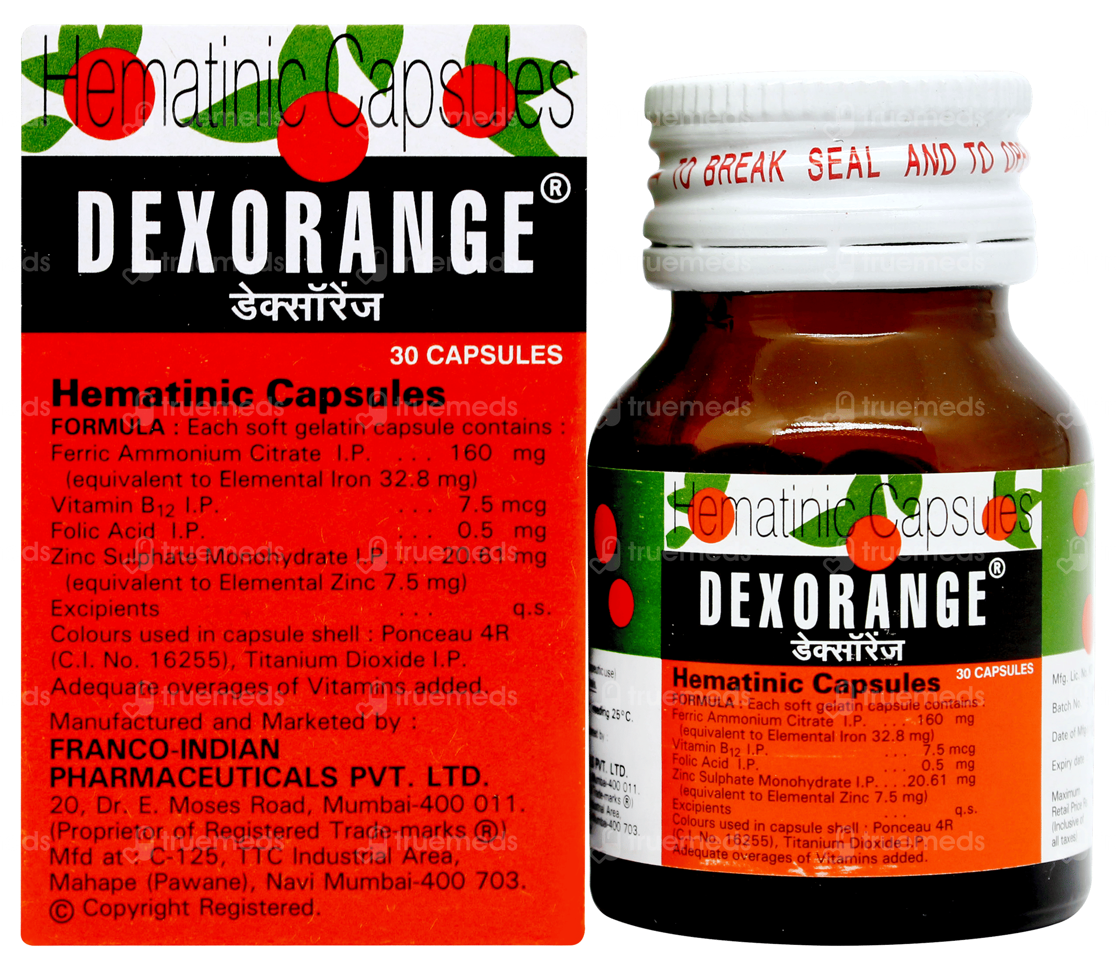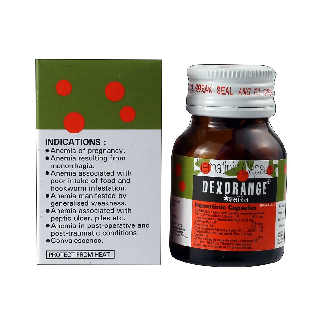 Dexorange Capsule ek आयरन (Iron) और विटामिन सप्लीमेंट है, jo sharir me खून की कमी (एनीमिया) ko door karne me madad karta hai. Yeh capsule haemoglobin badhane aur sharir ko taakat dene ke liye use kiya jata hai.